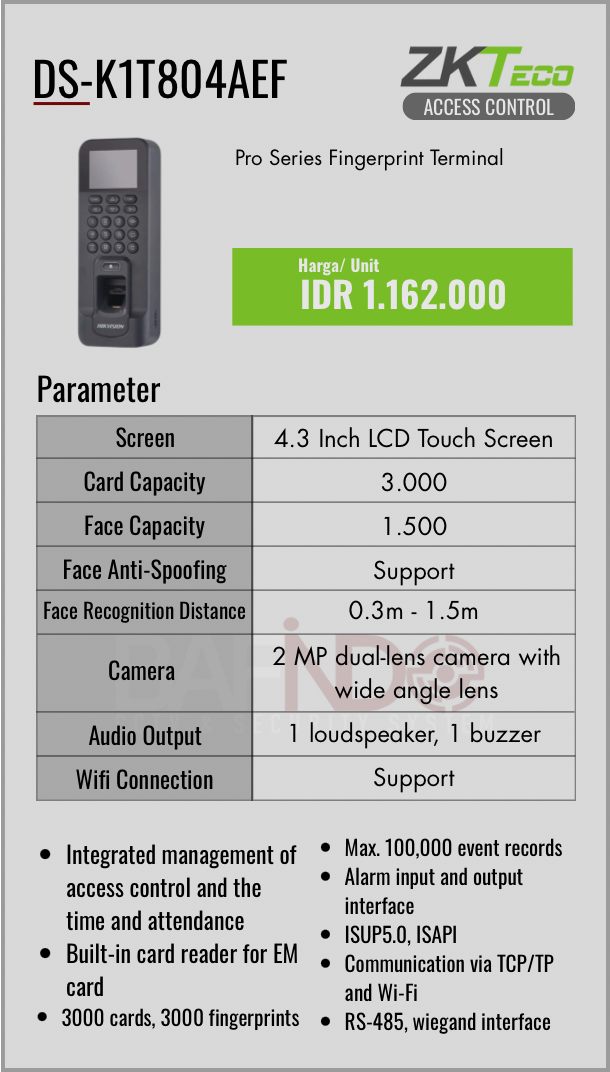 Solusi keamanan terpercaya untuk rumah dan bisnis Anda. Dilengkapi dengan teknologi ZKTeco (fingerprint, RFID, PIN) dan integrasi Hikvision CCTV, sistem ini memungkinkan kontrol akses real-time, manajemen pengguna yang mudah, dan pemantauan visual langsung.