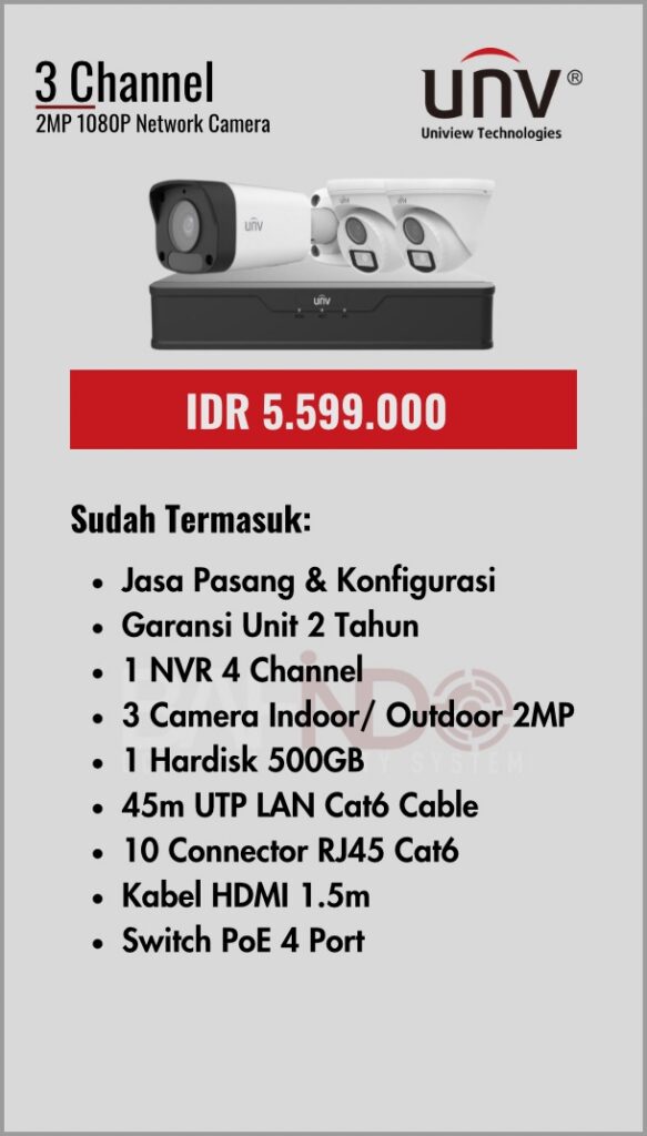 Paket yang sudah lengkap dengan kabel, garansi unit, DVR maupun NVR sampai jasa pasang mempermudah anda dalam pemasangan CCTV.